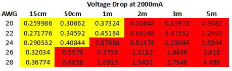 A voltage drop of nearly 0.5 V is possible with a hefty 22 gauge cable.